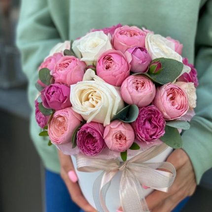 Коробка Робкий поцелуй из роз сорта квинси, охара, эустомы, генисты и диантуса