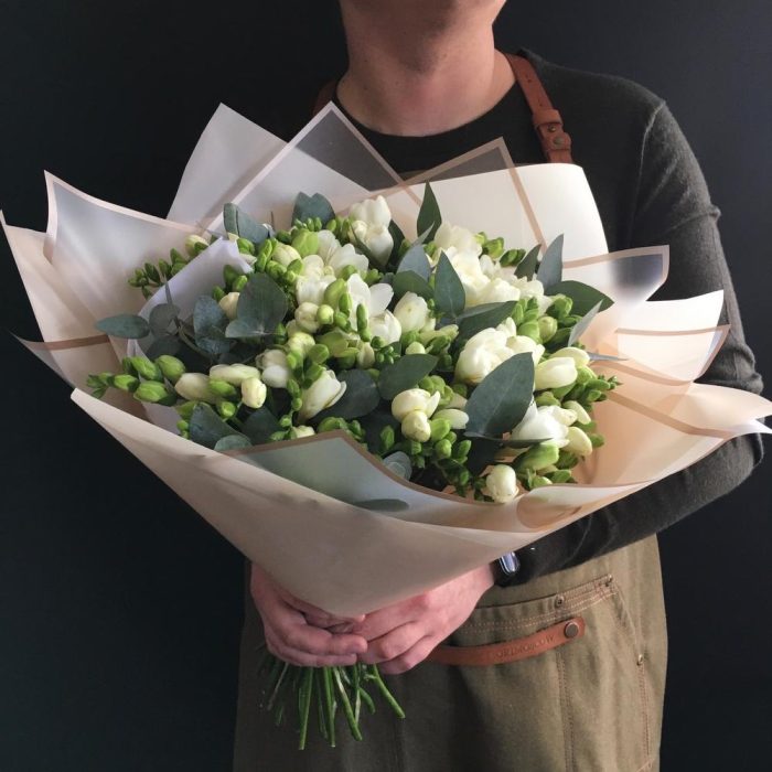 Фрезия белая – 49 шт.Эвкалипт – 20 шт.Упаковка дизайнерская – 5 шт.Лента атласная – 4 шт.