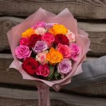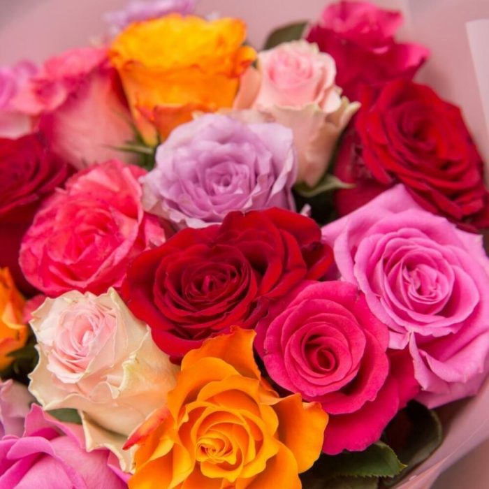 Multicoloured roses in stylish matte wrap film. Recipients will definitely appreciate these long-lasting roses.