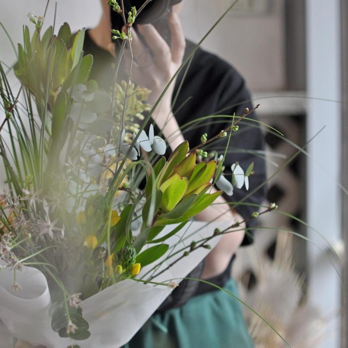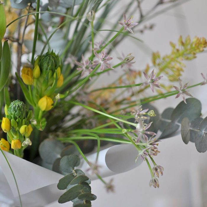 леукондендрон – 2 шт.Орнитогалум – 2 шт.Эвкалипт – 4 шт.Прунус – 3 шт.Берграсс – 3 шт.эремурус – 2 шт.Упаковка – 1 шт.Лента атласная – 1 шт.