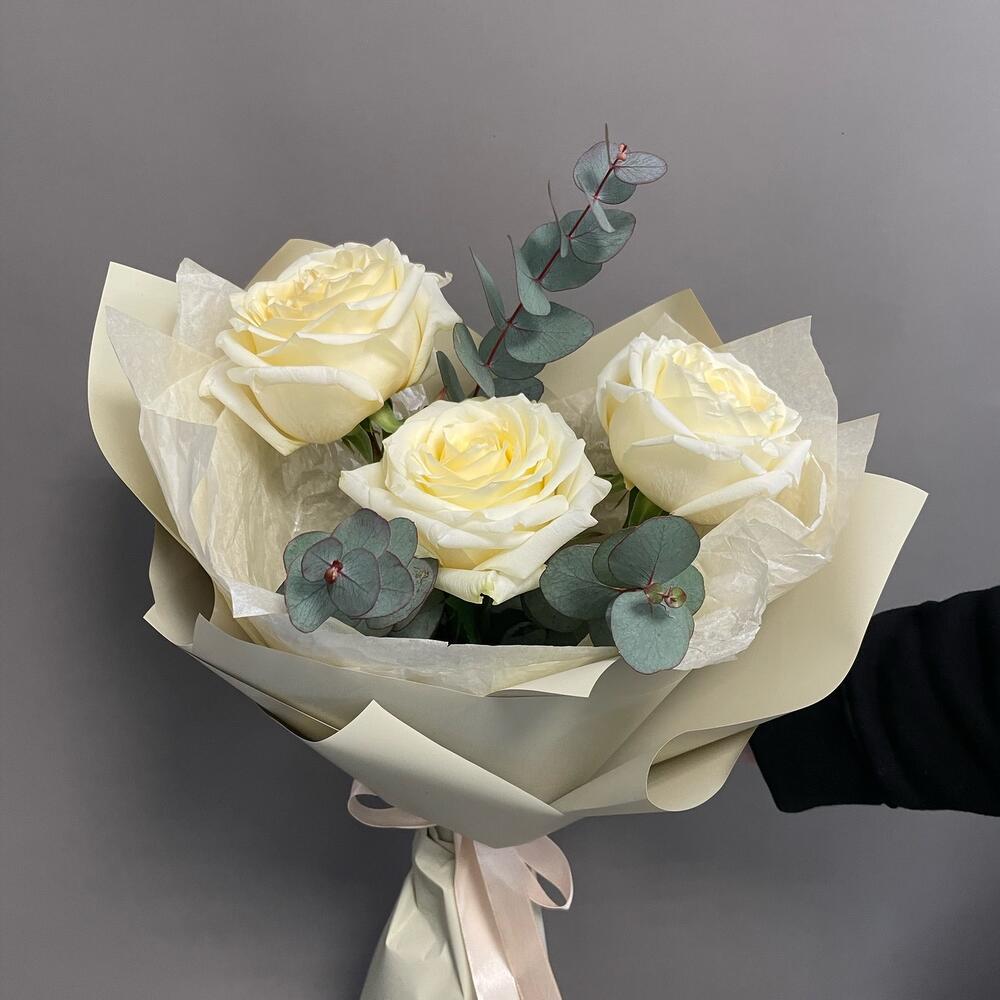 Эвкалипт – 2 шт.Лента атласная – 1 шт.Упаковка дизайнерская – 2 шт.розы кендилайт – 3 шт.