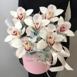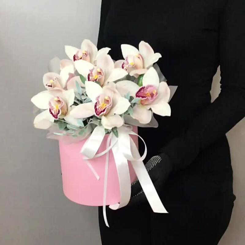 Лента атласная – 1 шт.Оазис флористический – 1 шт.Цимбидиум белый – 7 шт.фисташка крашенная – 3 шт.коробка шляпная 16х16 – 1 шт.