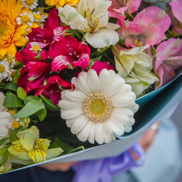 Гербера белая – 4 шт.Гербера красная – 2 шт.Гербера желтая – 2 шт.Эвкалипт – 4 шт.Матрикария – 4 шт.Альстромерия красная – 2 шт.Альстромерия желтая – 2 шт.Альстромерия белая – 2 шт.Альстромерия розовая – 2 шт.Альстромерия фиолетовая – 2 шт.