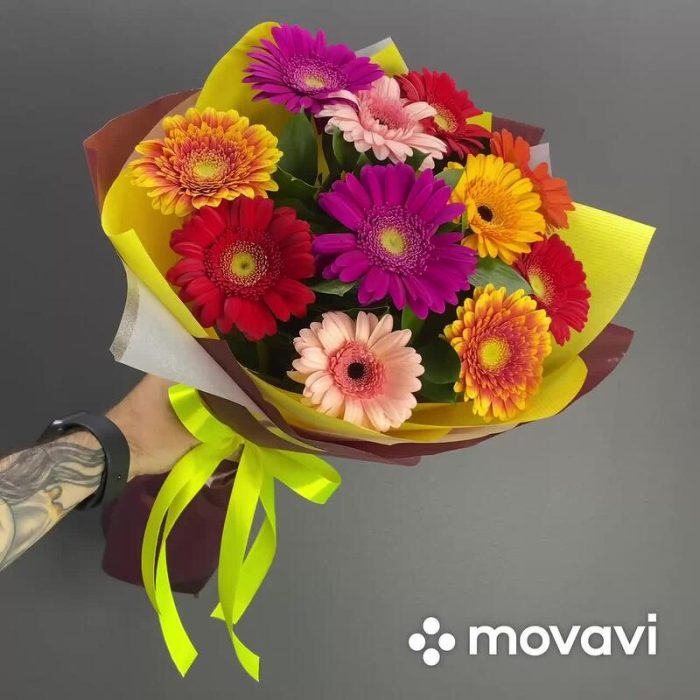 Рускус – 8 шт.Лента атласная – 1 шт.Гербера – 11 шт.Упаковка дизайнерская – 1 шт.