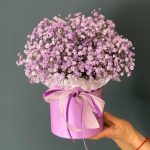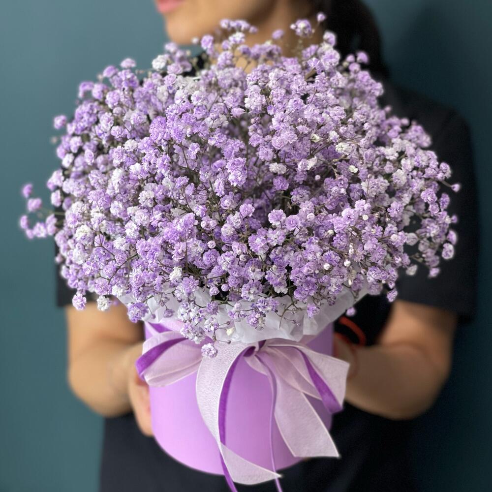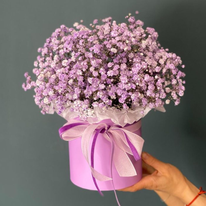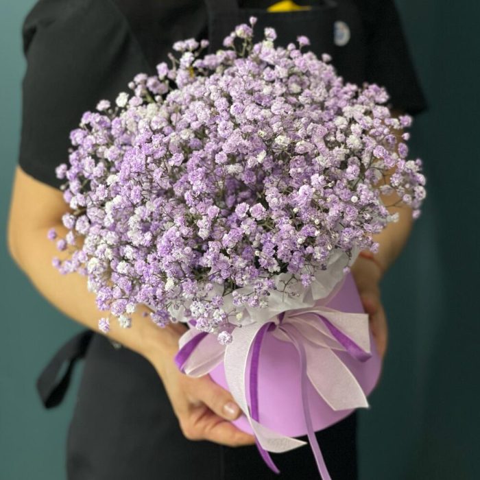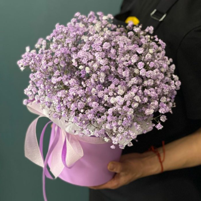 “Сиреневый туман” – композиция из гипсофилы в шляпной коробке
