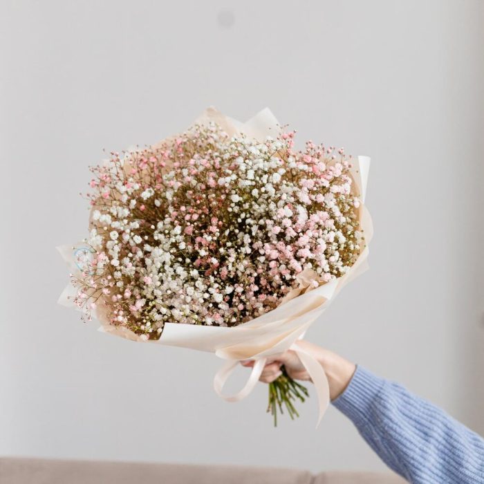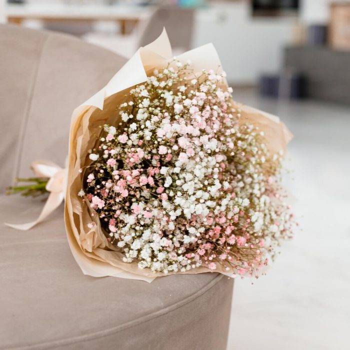 Очаровательный букет из воздушной гипсофилы. Ни одна дама, точно не останется равнодушной при виде такого букета.Инструкция по уходу за цветами прикреплена к каждому заказу.Цветы гипсофилы отличаются стойкостью и даже при высыхании не теряют, декоративности и цвета. Что позволяет, долгое время украшать интерьер в качестве сухоцветов.Подпишем открытку с вашими пожеланиями бесплатно