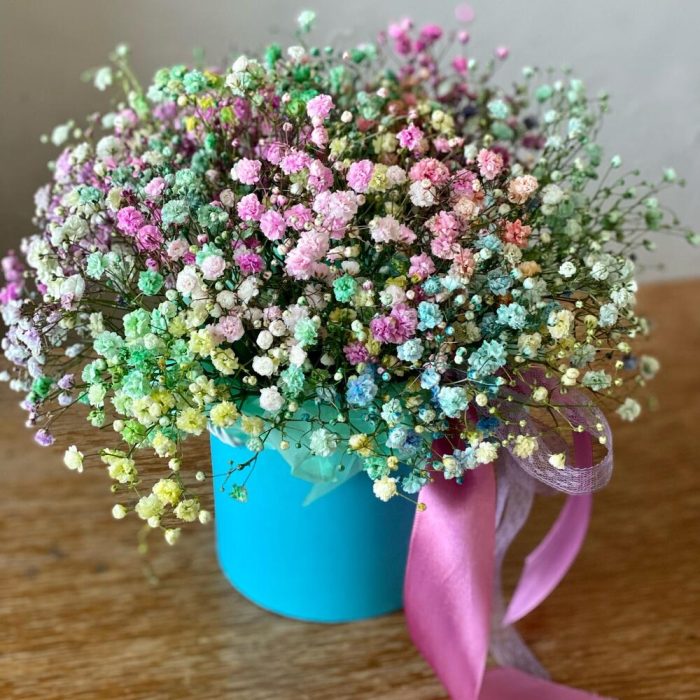 Тишью – 1 шт.Оазис – 1 шт.Шляпная коробка – 1 шт.гипсофила радужная – 5 шт.