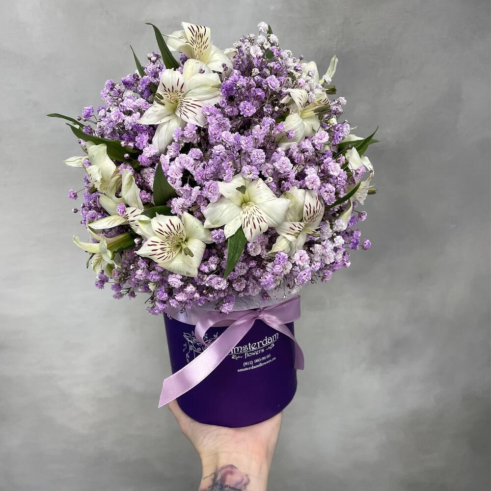 Альстромерия – 5 шт. Коробка шляпная – 1 шт. Оазис флористический – 1 шт. гипсофила сиреневая – 5 шт.