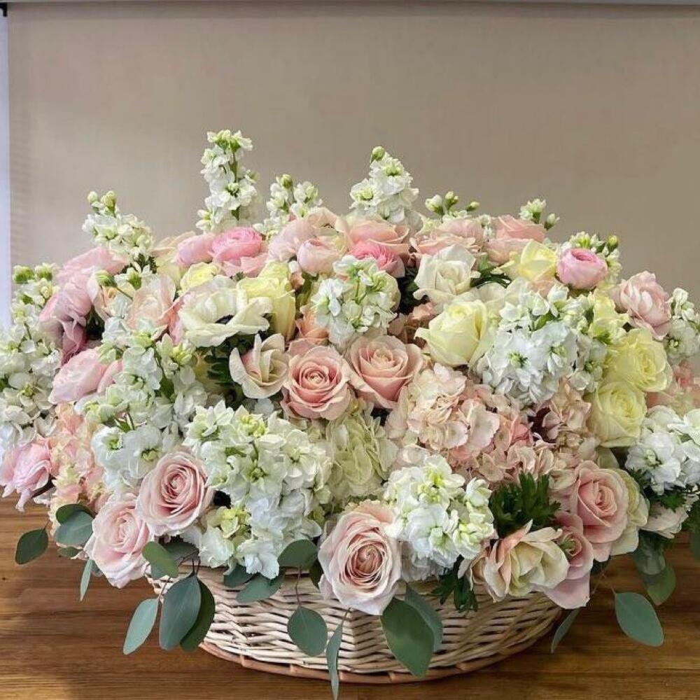 розы одноголовые – 40 шт.Маттиола – 45 шт.Гортензия – 10 шт.Корзина плетеная – 1 шт.Открыточка с вашими пожеланиями – 1 шт.хорошое настроение – 100 шт.инструкция по уходу за цветами – 1 шт.Оазис флористический – 1 шт.Кризал – 1 шт.