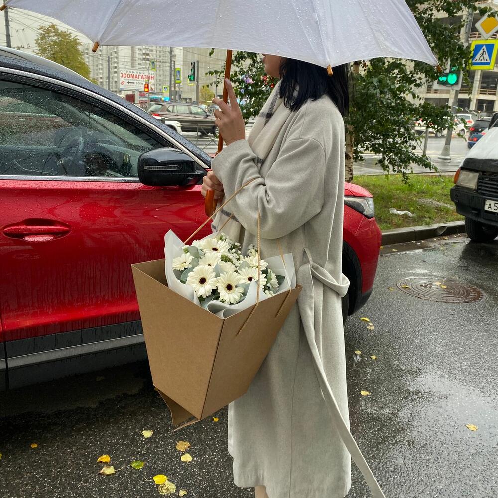 Гербера – 9 шт.Статица – 2 шт.Салал – 5 шт.Упаковка – 3 шт.Гвоздика – 3 шт.Сумка крафт – 1 шт.