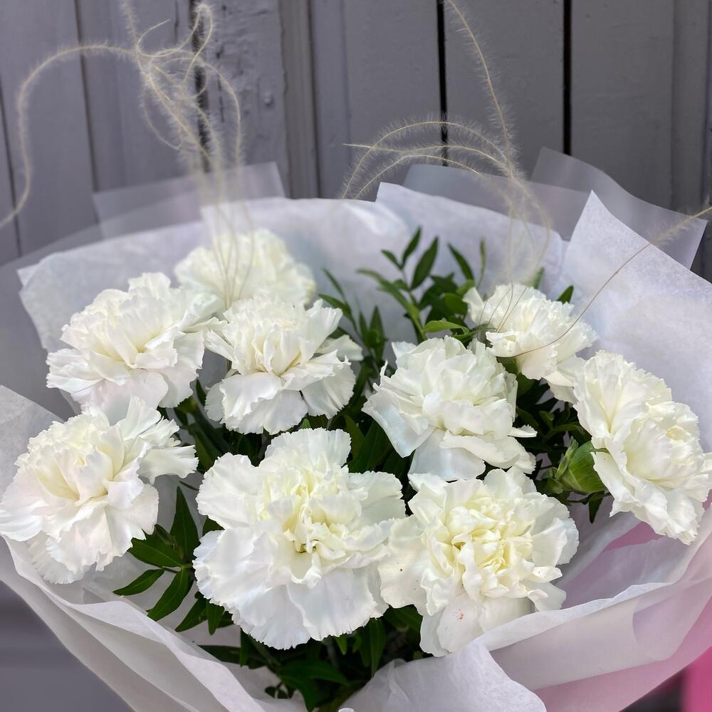 Диантус – 9 шт.Фисташка – 1 шт.Упаковка дизайнерская – 4 шт.Лента атласная – 1 шт.
