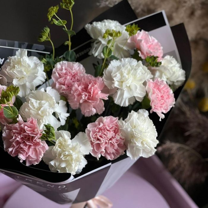 Гвоздика сортовая – 15 шт.Буплерум – 2 шт.Авторская упаковка – 1 шт.памятка по уходу – 1 шт.крафт конверт – 1 шт.