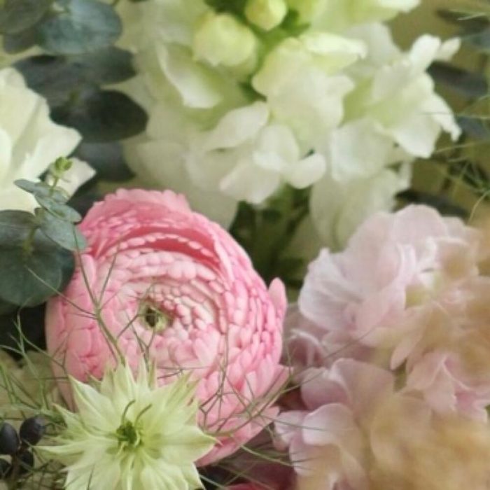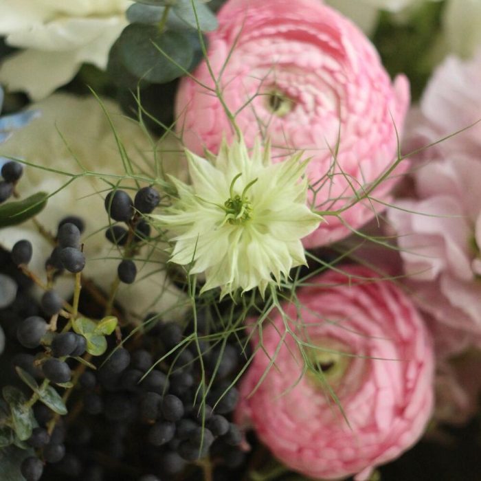 Ранункулюс – 2 шт.Львиный зев – 1 шт.Маттиола – 1 шт.Диантус – 3 шт.Твидия – 2 шт.тмин – 2 шт.Сантини – 1 шт.лигуструм – 1 шт.Эвкалипт – 1 шт.Упаковка – 1 шт.