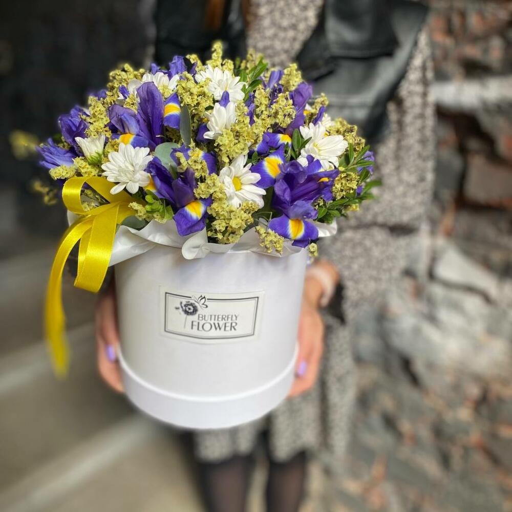 Шляпная коробка – 1 шт.Оазис – 1 шт.Лимониум – 3 шт.Ирис – 15 шт.Хризантема кустовая – 2 шт.Самшит – 2 шт.Лента – 2 шт.