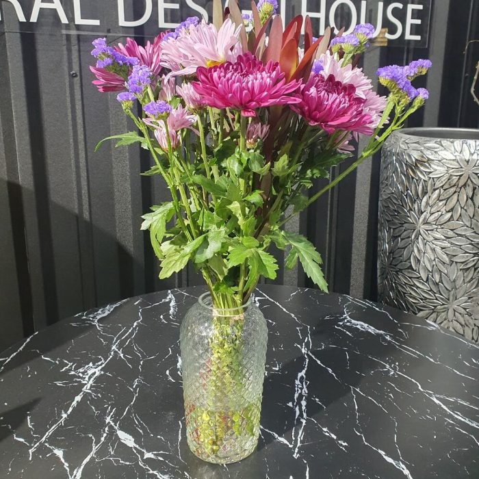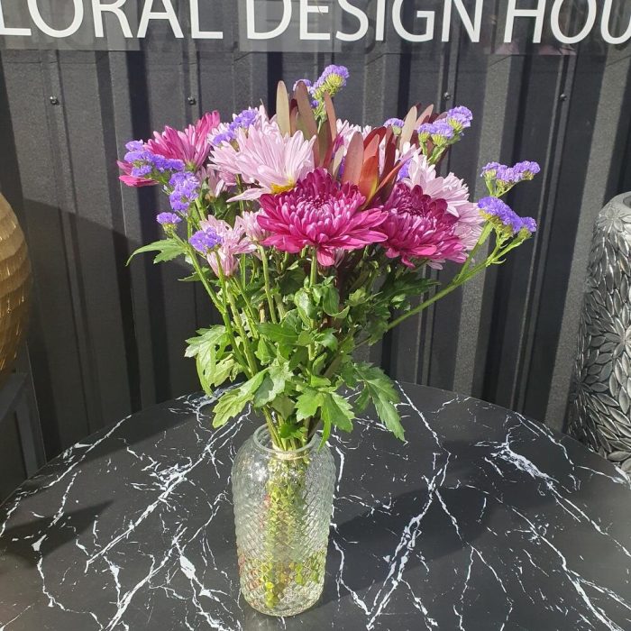 Хризантема кустовая – 5 шт. хризантема бигуди – 5 шт. Статица – 2 шт. левкадендрон – 3 шт.