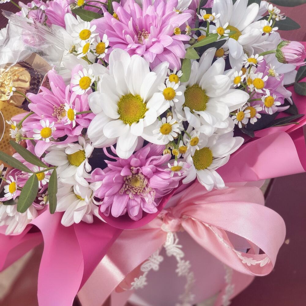 Хризантема кустовая – 3 шт.Лента атласная – 1 шт.Коробка шляпная – 1 шт.Ромашка кустовая – 2 шт.Открыточка с вашими пожеланиями – 1 шт.тесьма кружево – 1 шт.шоколад ферреро – 1 шт.любовь флориста (бесплатно) – 1 шт.