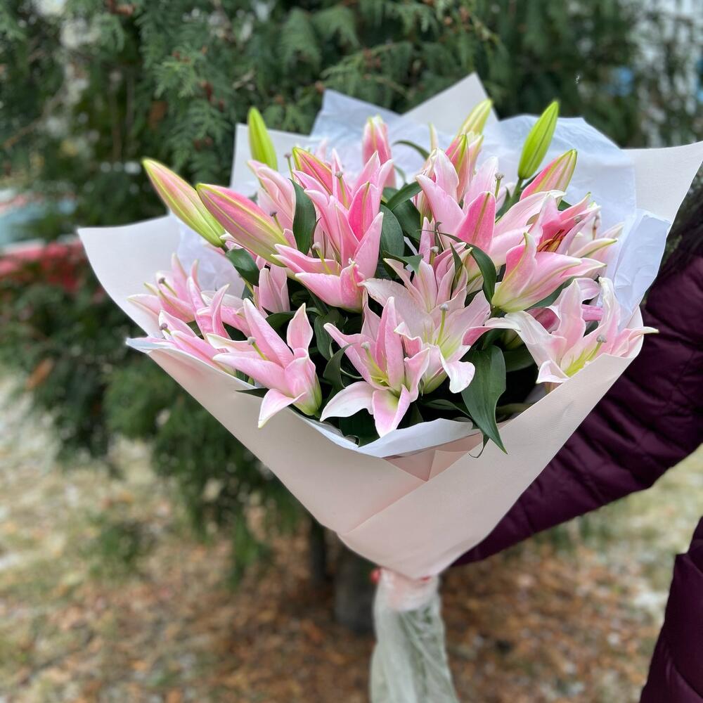 Тишью – 3 шт.лилия ориентальная розовая – 7 шт.структурированный фаомиран – 3 шт.