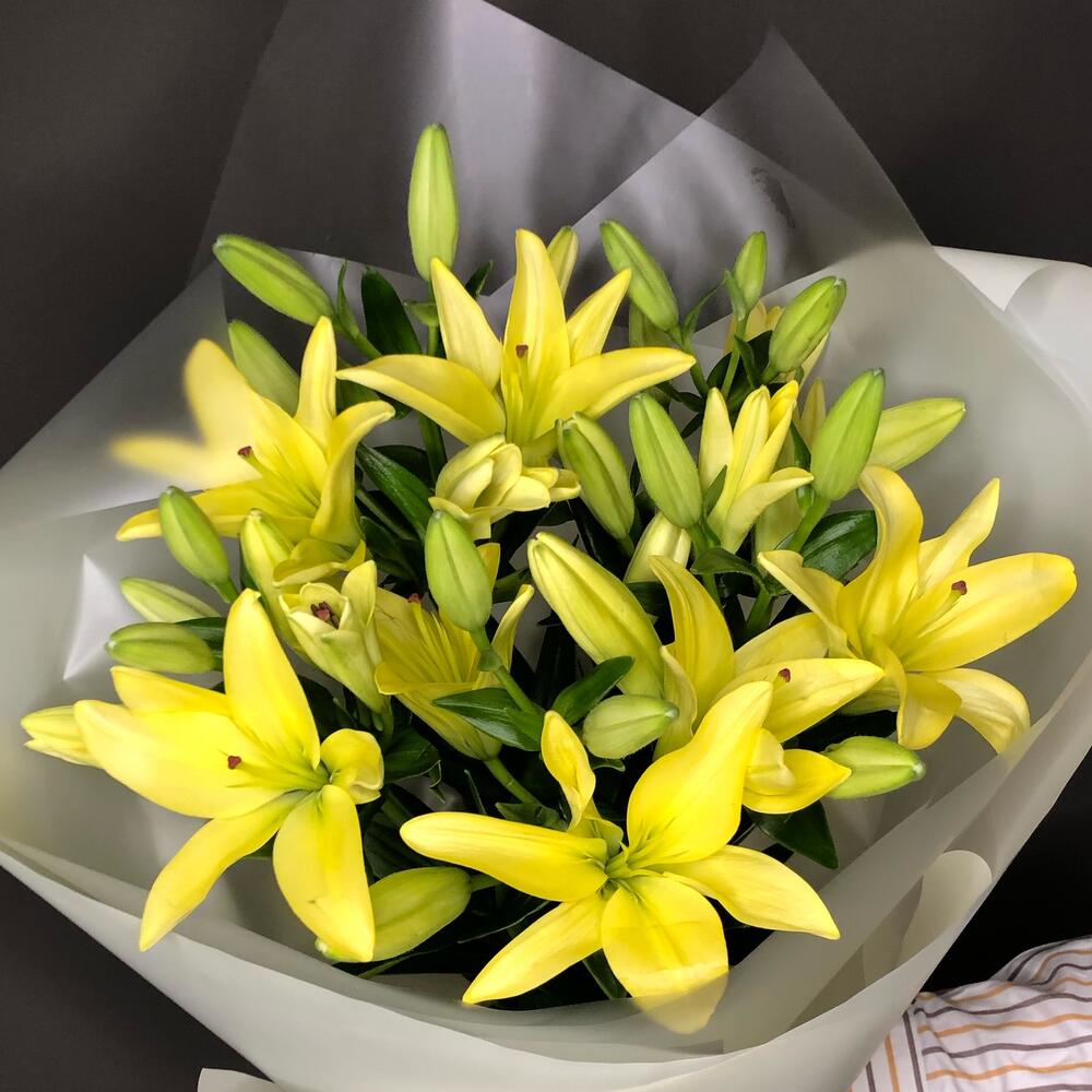 Лента атласная – 1 шт.Пленка матовая – 7 шт.лилия желтая лимонная – 5 шт.