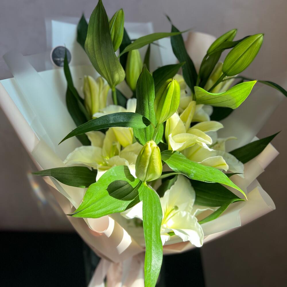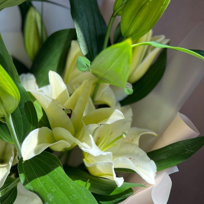 Лилия – 3 шт.Атласная лента – 1 шт.декоративная упаковка – 1 шт.