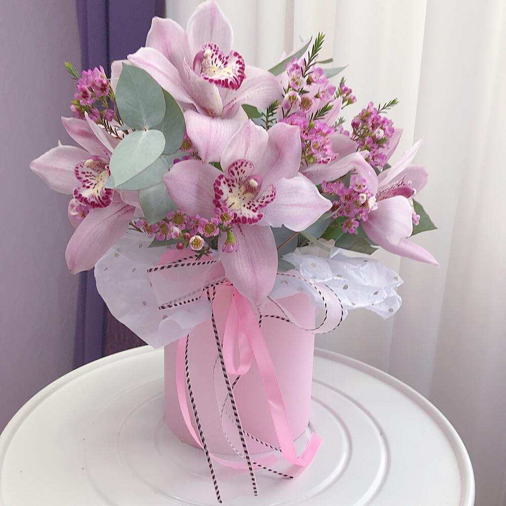 Орхидея Цимбидиум – 11 шт.Хамелациум – 3 шт.Эвкалипт – 3 шт.Лента атласная – 2 шт.