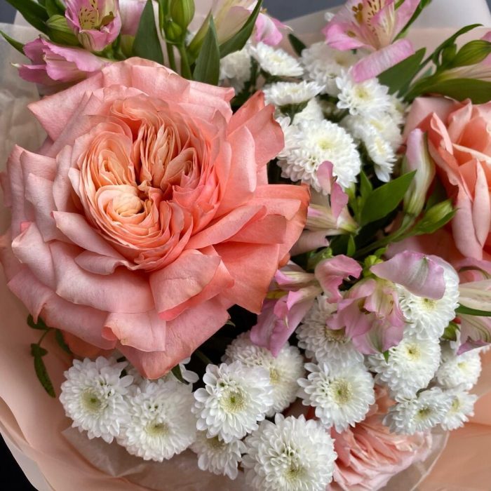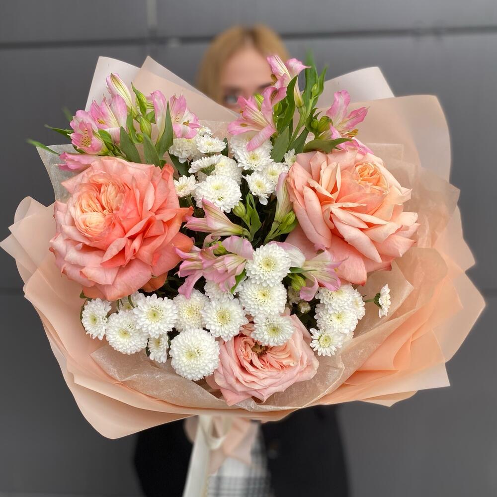 Роза пионовидная – 3 шт.Сантини – 3 шт.Альстромерия – 3 шт.