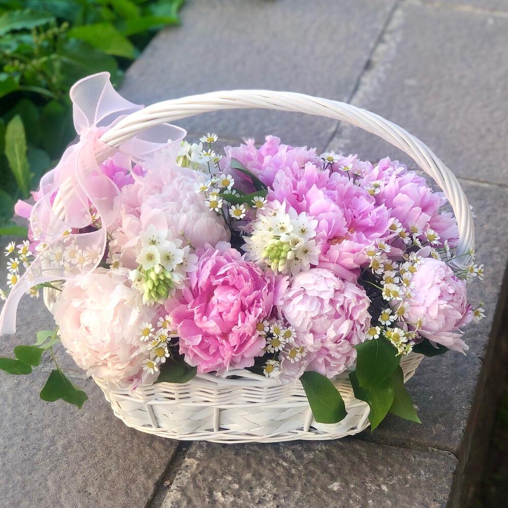 Зелень – 3 шт.Орнитогалум – 3 шт.Матрикария – 6 шт.Пион Сара Бернар – 11 шт.Корзина плетеная – 1 шт.Оазис флористический – 1 шт.