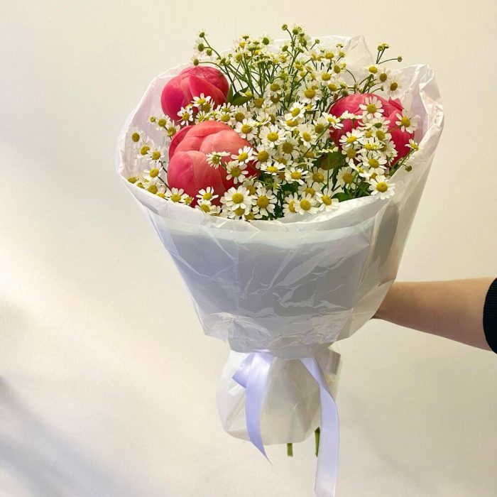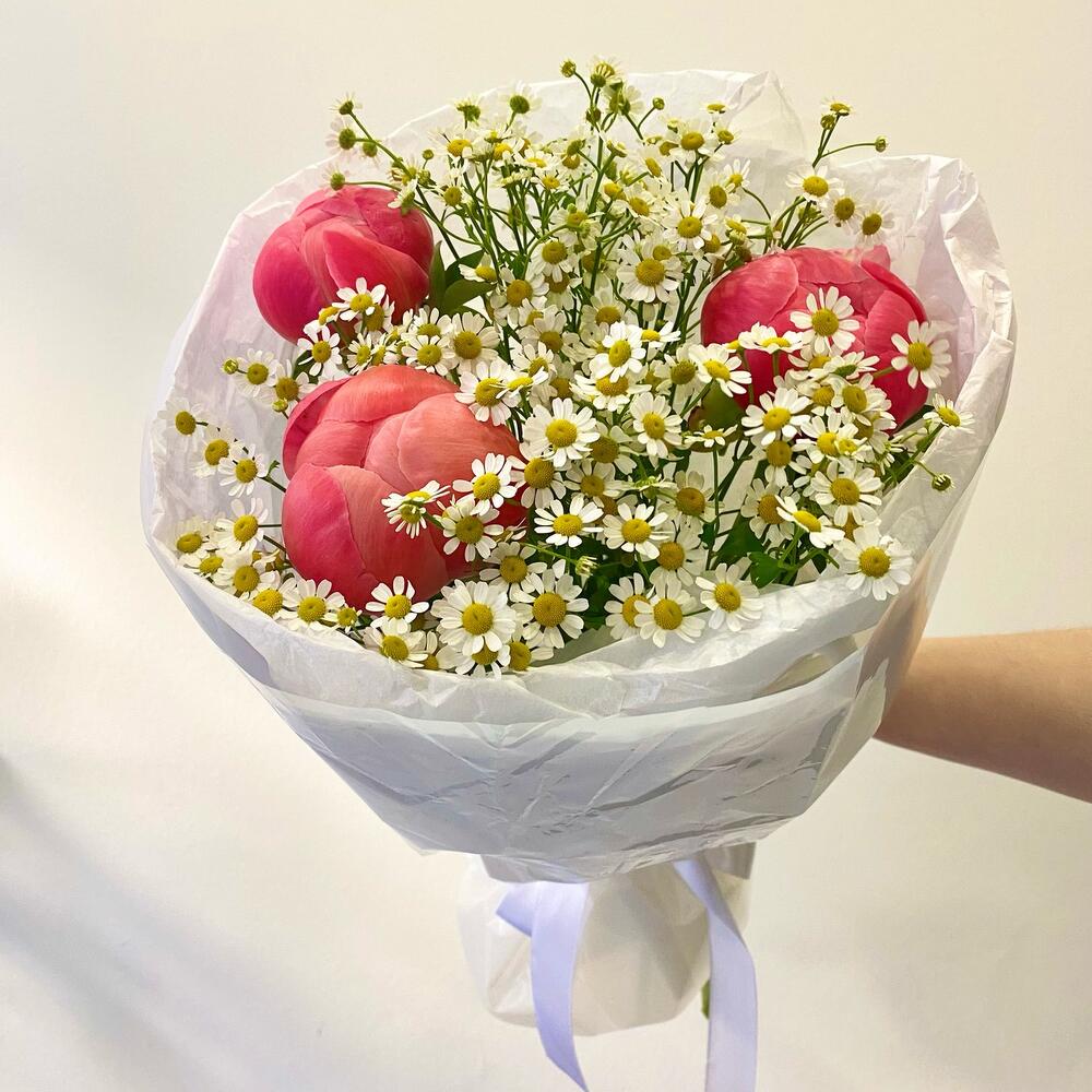 Пион коралл шарм – 3 шт.Матрикария – 5 шт.Упаковка дизайнерская – 1 шт.