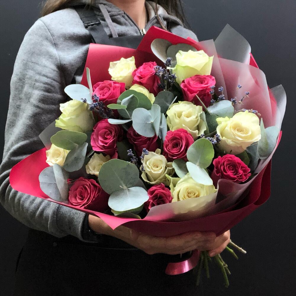 19 роз с эвкалиптом и лавандой