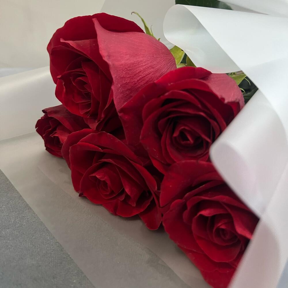 красные розы эквадор 60 см – 5 шт.Дизайнерская упаковка – 1 шт.Атласная лента – 1 шт.
