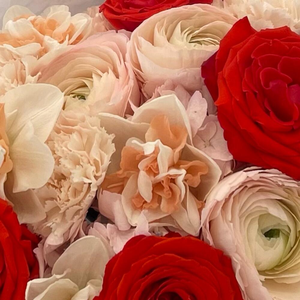 Ранункулюс – 3 шт.Нарцисс – 4 шт.Гортензия – 1 шт.нина роза – 5 шт.Гвоздика – 5 шт.