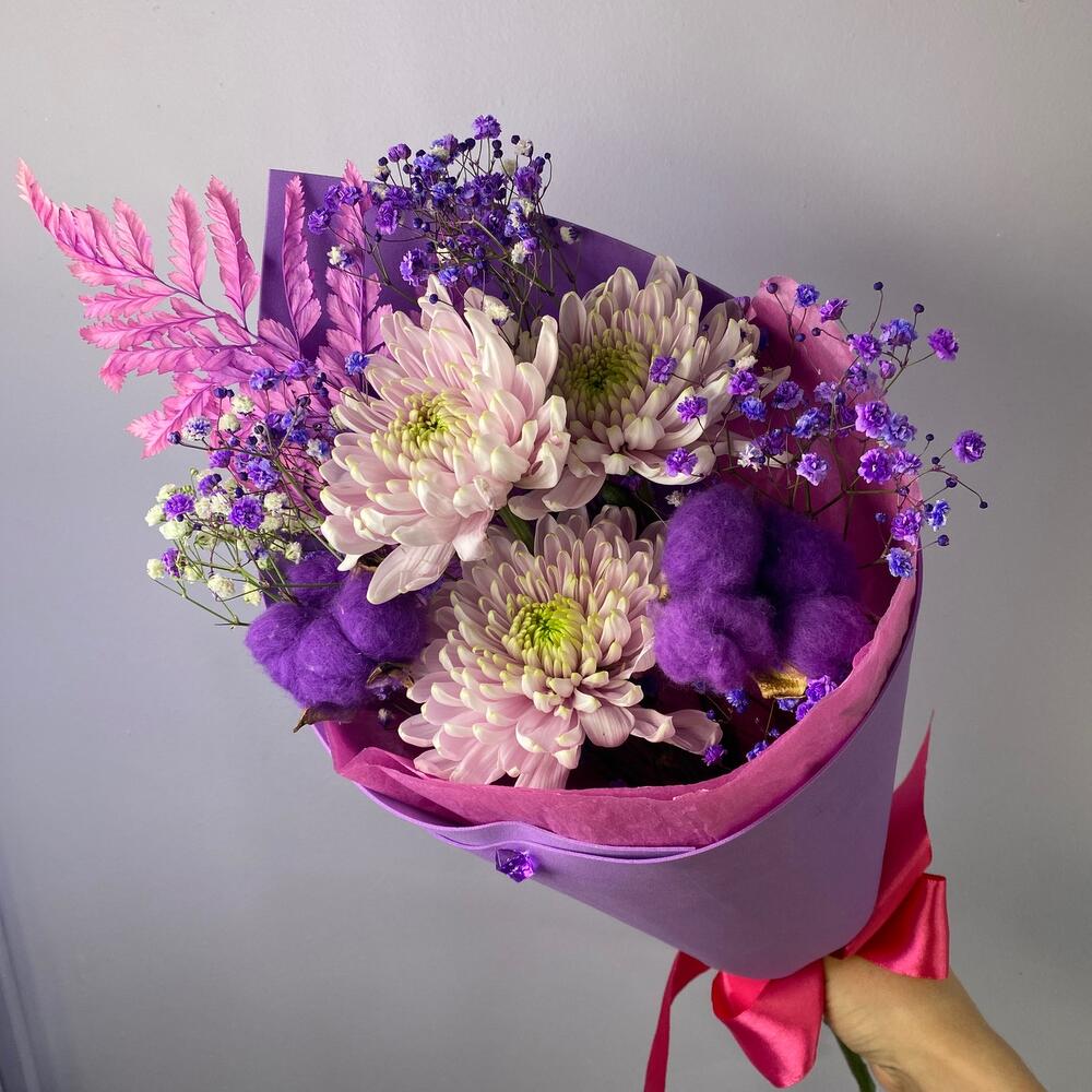 Папоротник – 1 шт.Хлопок – 2 шт.Упаковка дизайнерская – 2 шт.Хризантема розанна – 3 шт.гипсофила радужная – 1 шт.