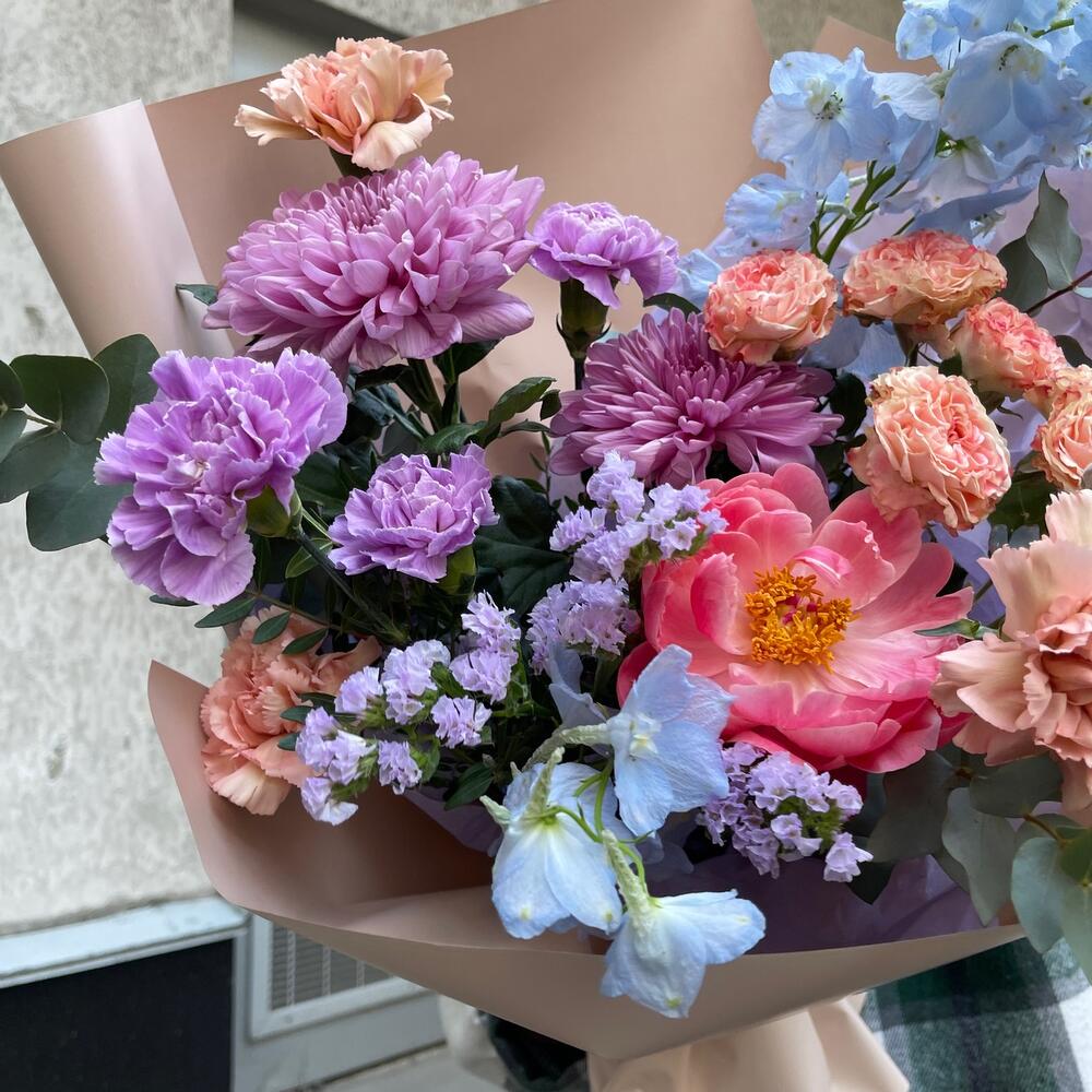 Дельфиниум – 2 шт.Пион – 1 шт.Статица – 1 шт.Эвкалипт – 3 шт.Диантус – 6 шт.Роза пионовидная кустовая – 1 шт.Фисташка – 1 шт.Хризантема одноголовая – 2 шт.Твидия – 1 шт.