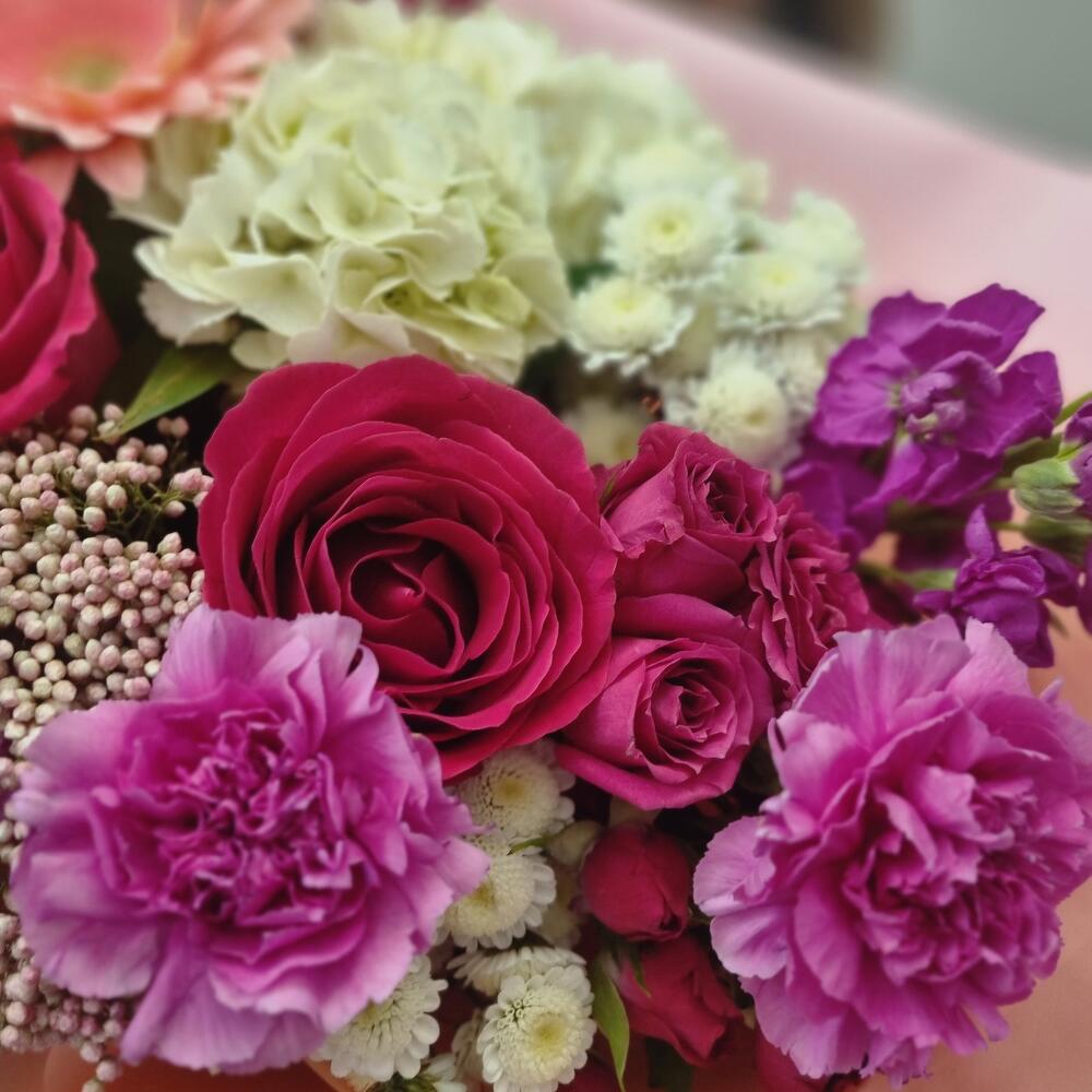 Гербера – 3 шт.Гортензия – 1 шт.Гвоздика – 3 шт.Кустовая роза – 3 шт.Маттиола – 1 шт.левкое – 1 шт.азатанус – 1 шт.Хризантема кустовая – 3 шт.Роза Эквадор – 3 шт.Упаковка дизайнерская – 1 шт.зелень декоративная – 2 шт.