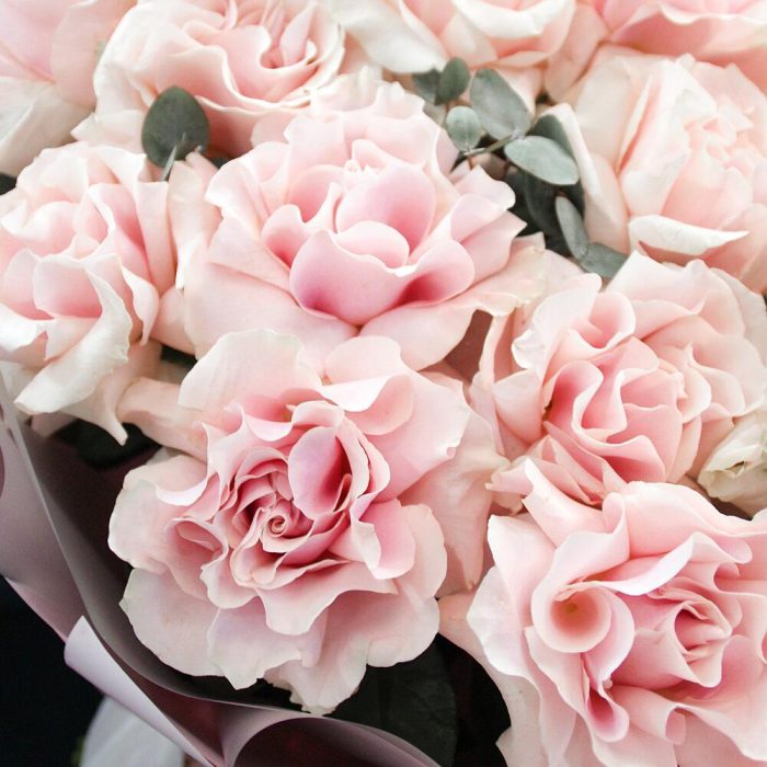 Эвкалипт – 2 шт.Атласная лента – 2 шт.Французская роза – 15 шт.Матовая пленка – 3 шт.