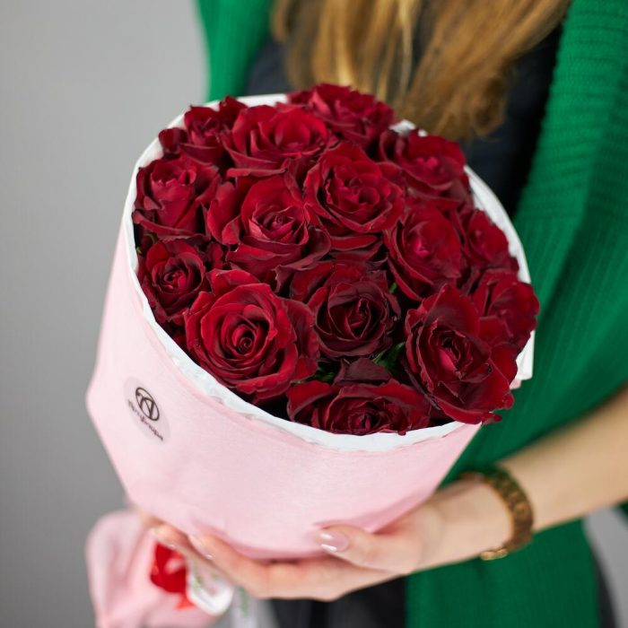 Букет 15 красных роз в розовой упаковке