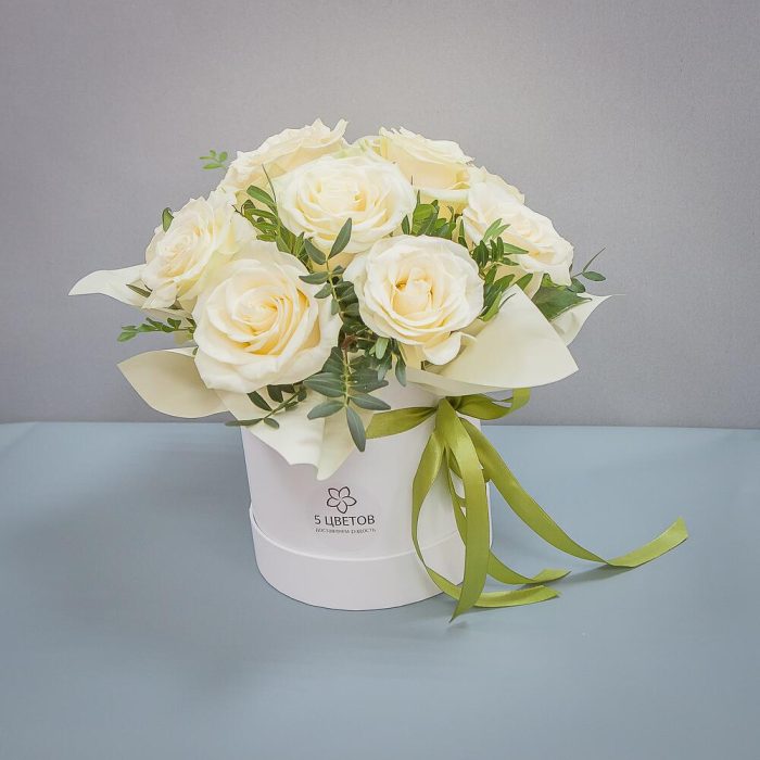 Роза белая – 9 шт.Коробка шляпная – 1 шт.