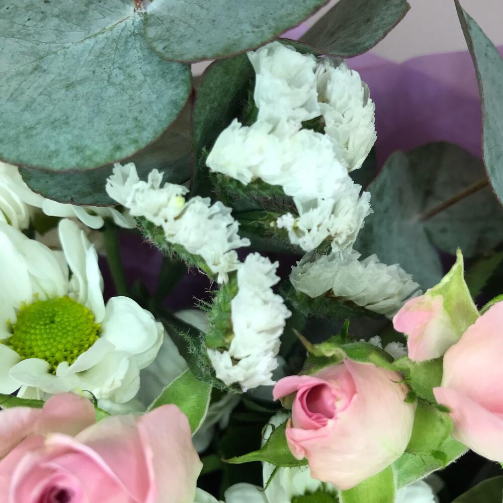 Роза кустовая – 5 шт.Диантус – 3 шт.Сантини – 2 шт.Статица – 1 шт.Эвкалипт – 1 шт.Упаковка дизайнерская – 3 шт.