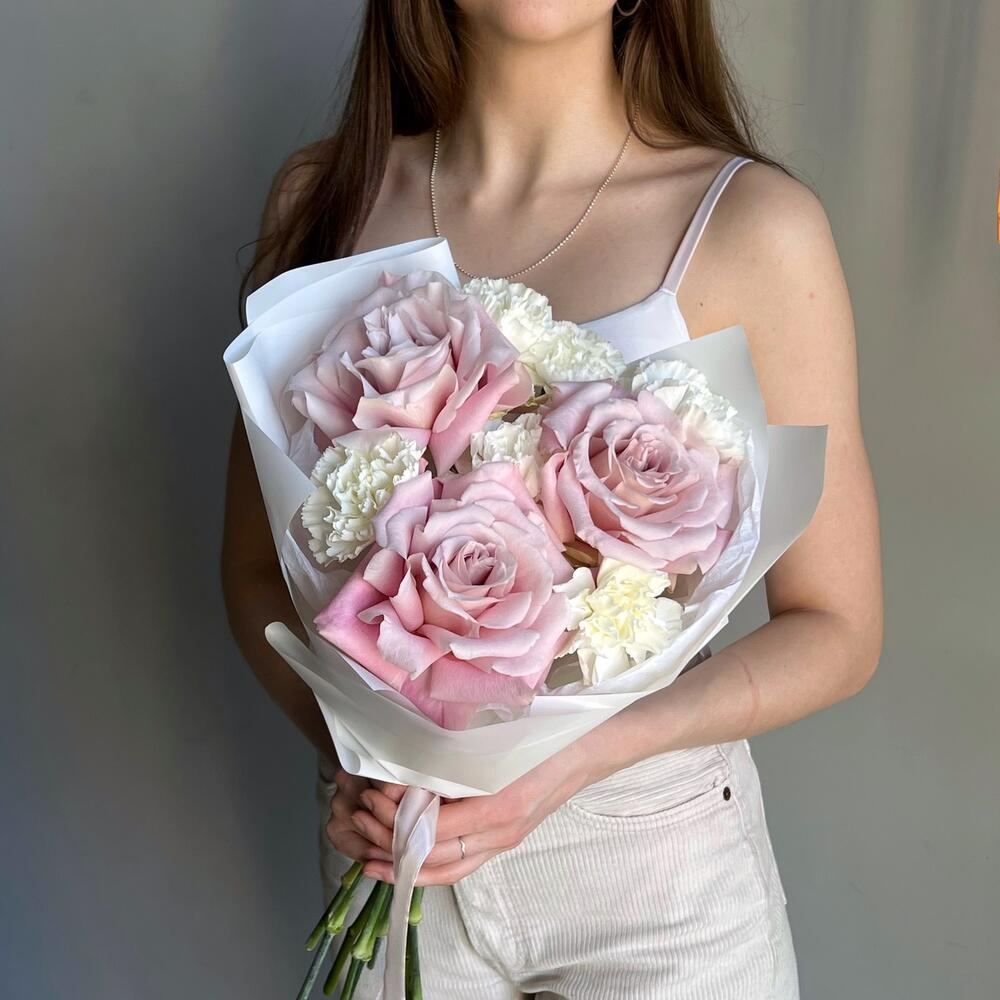 Лента – 1 шт.Гвоздика – 6 шт.Дизайнерская упаковка – 1 шт.роза faith премиум – 3 шт.