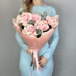 Лента атласная – 1 шт.Французская роза – 5 шт.Дизайнерская упаковка – 1 шт.эвкалипт цинерея пучок – 1 шт.влагостойкий тишью – 1 шт.