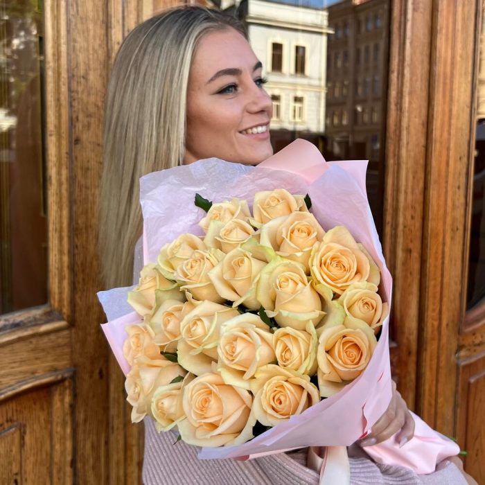 роза персиковая 60 см – 19 шт.Тишью – 1 шт.Дизайнерская упаковка – 3 шт.Лента атласная – 1 шт.
