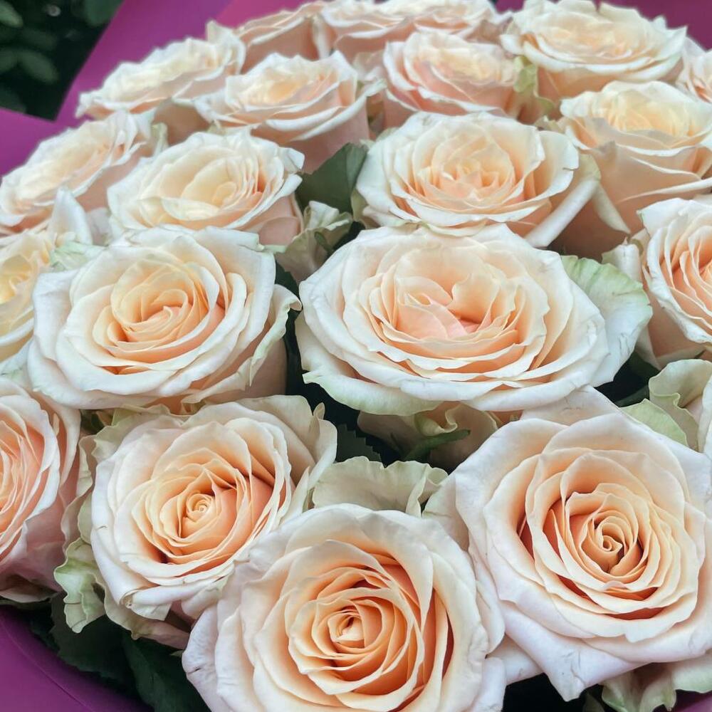 Лента атласная – 1 шт.Упаковка дизайнерская – 2 шт.Кремовая роза – 21 шт.