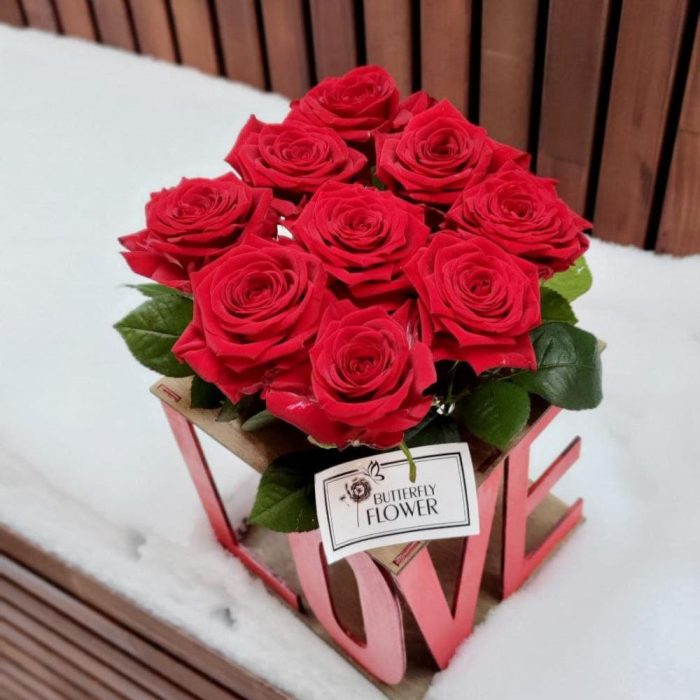 Букет из 9 роз в коробке с колбами “Love”