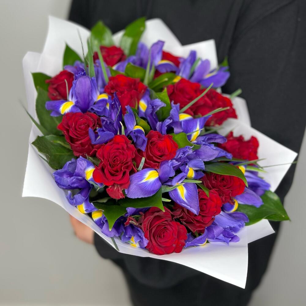 Роза красная – 13 шт.Ирис – 12 шт.Рускус сочи – 10 шт.Упаковка дизайнерская – 2 шт.