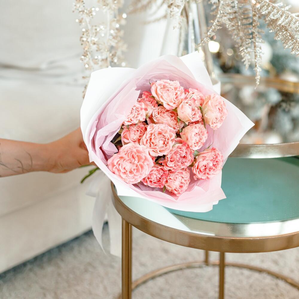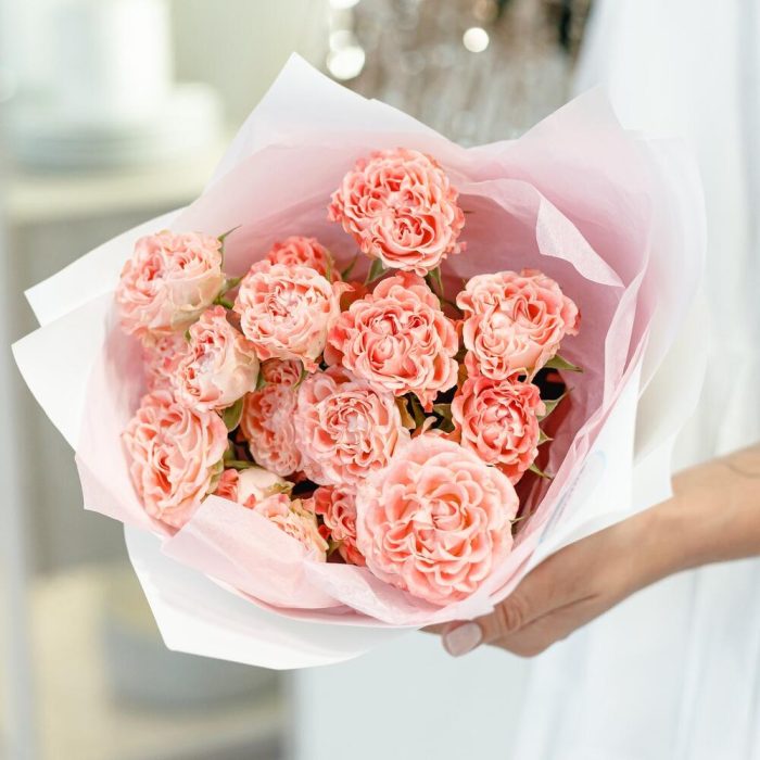 Роза кустовая пионовидная – 5 шт.Тишью – 2 шт.Корейская пленка – 2 шт.Атласная лента – 1 шт.инструкция по уходу за цветами – 1 шт.крафтовый пакет – 1 шт.