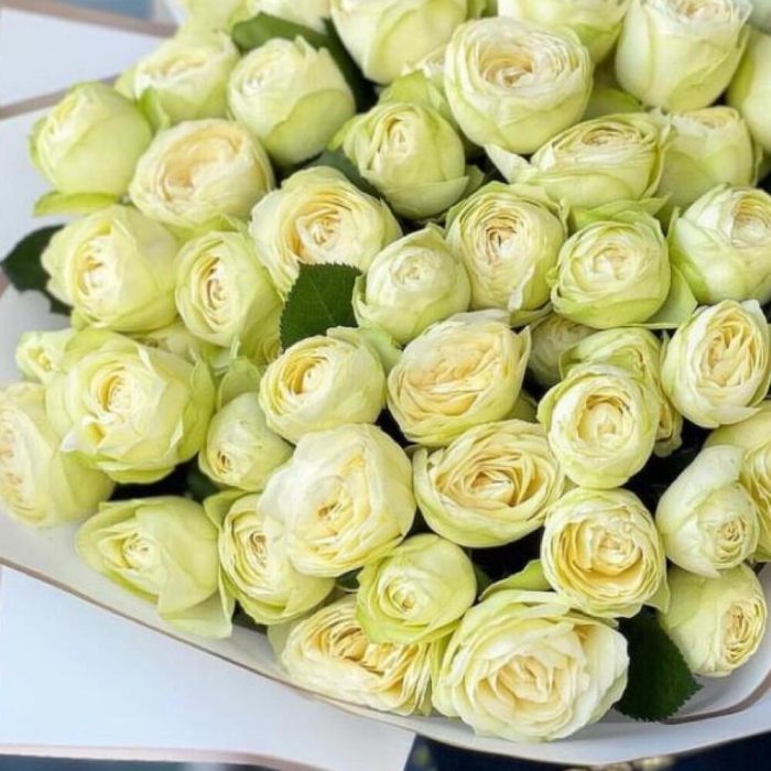 розы пионовидные белые – 65 шт.Упаковка дизайнерская – 2 шт.Лента атласная – 2 шт.Открыточка с вашими пожеланиями – 1 шт.хорошее настроение – 100 шт.инструкция по уходу за цветами – 1 шт.коробка переноска – 1 шт.Кризал – 1 шт.