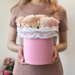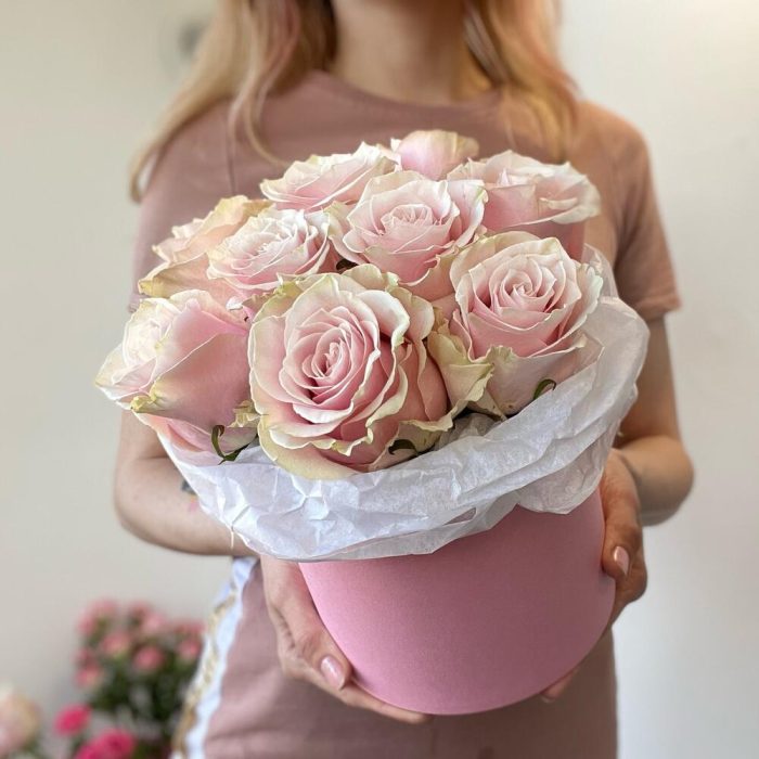 Розовая роза – 9 шт.Шляпная коробка с лентами – 1 шт.