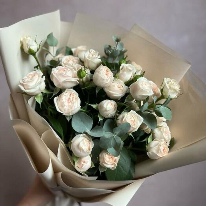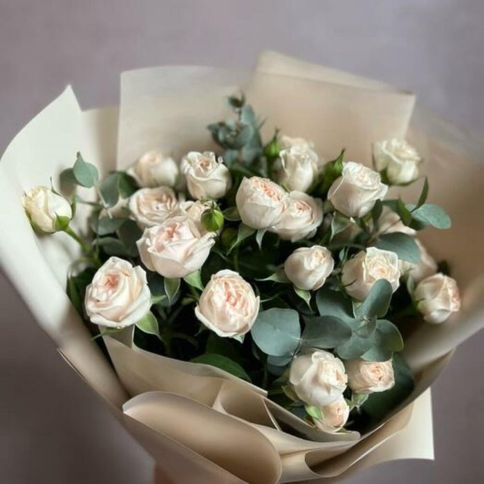 Кустовая пионовидная роза – 5 шт.Эвкалипт – 5 шт.декоративная упаковка – 1 шт.Атласная лента – 1 шт.