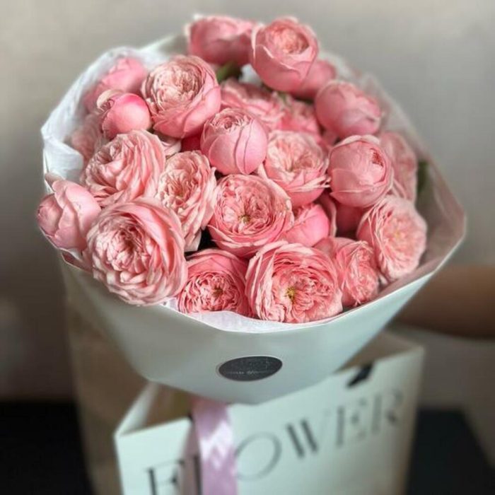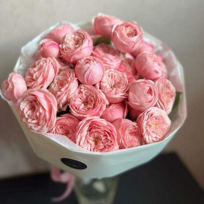Кустовая пионовидная роза – 9 шт.декоративная упаковка – 1 шт.Атласная лента – 1 шт.