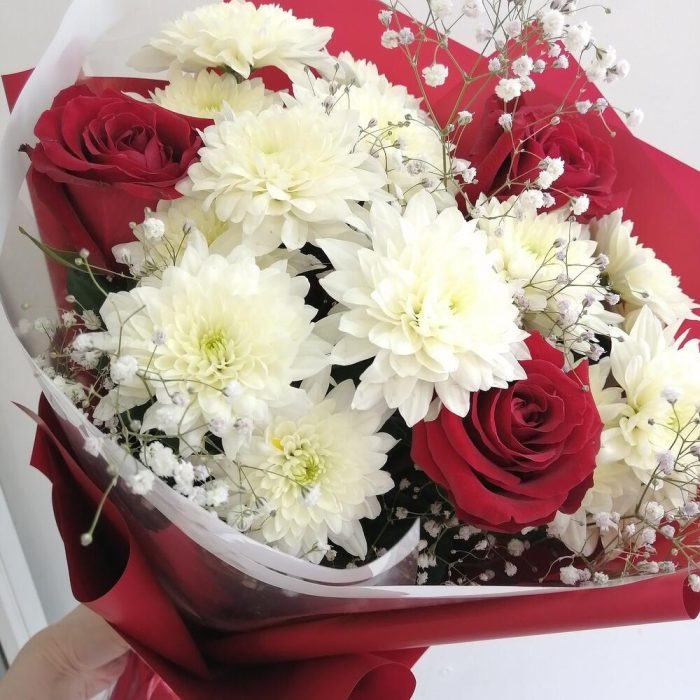 Гипсофила – 1 шт.Хризантема кустовая – 3 шт.Роза – 3 шт.Упаковка – 1 шт.