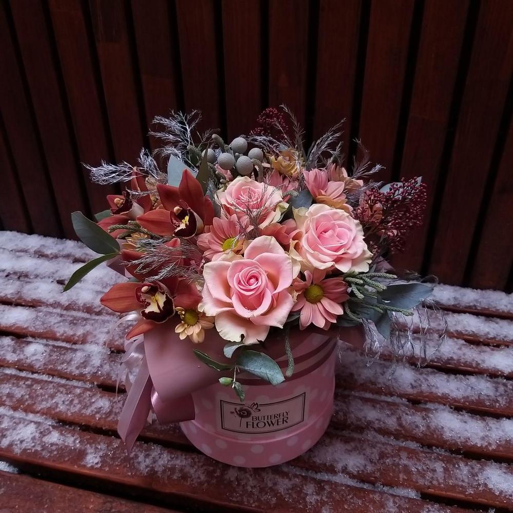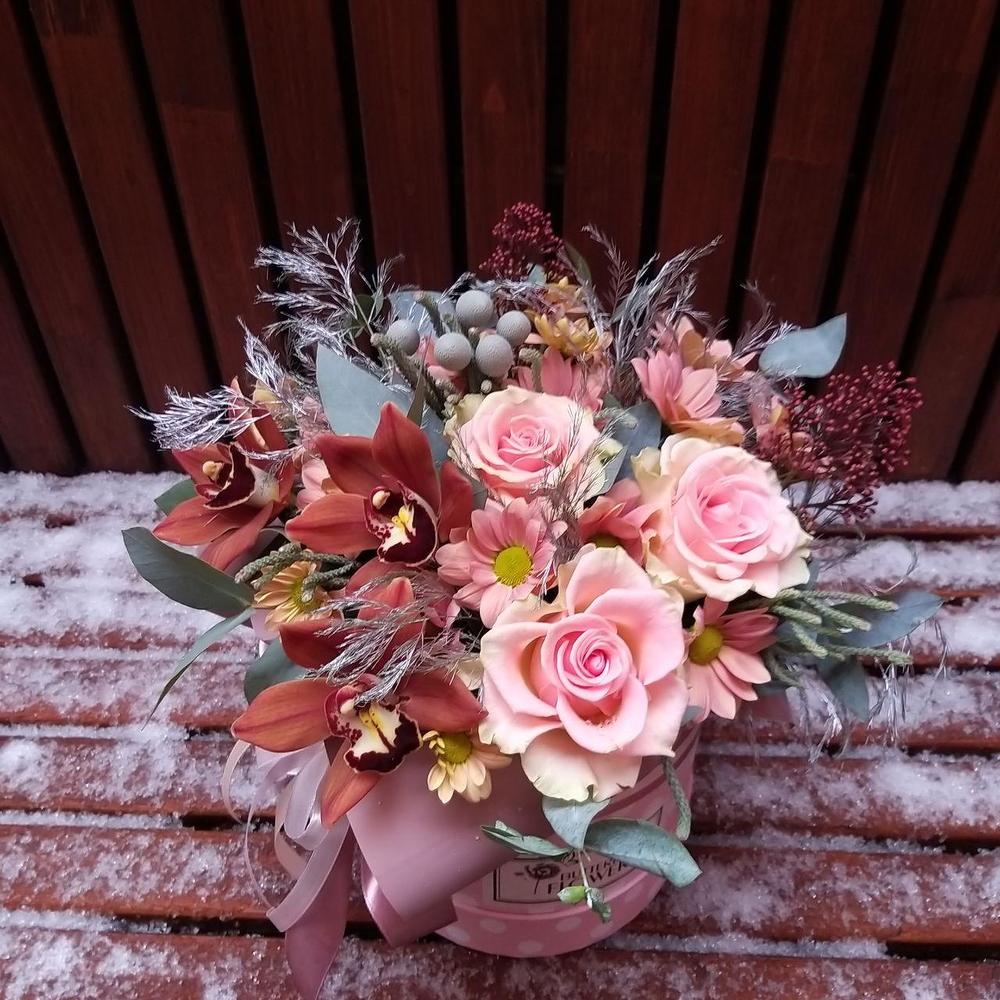 Букет из роз, кустовой хризантемы, цимбидиума и брунии в стильной шляпной коробке “Винтаж”